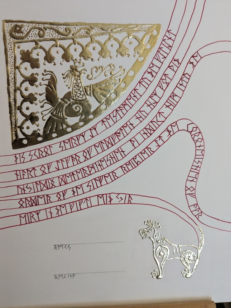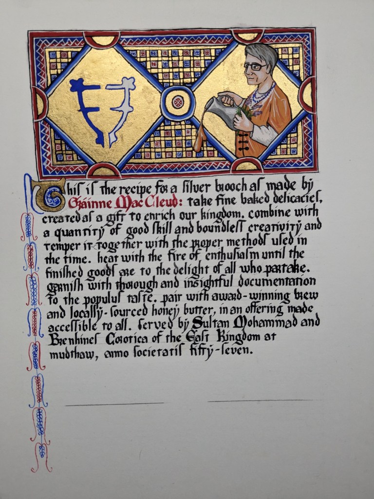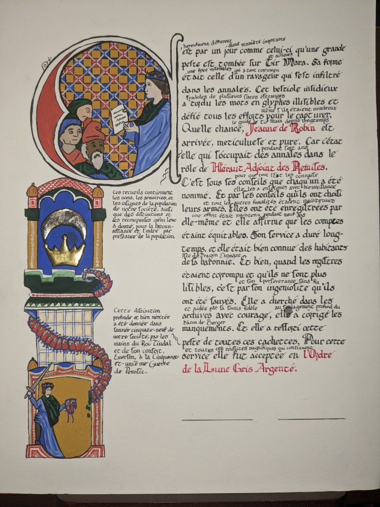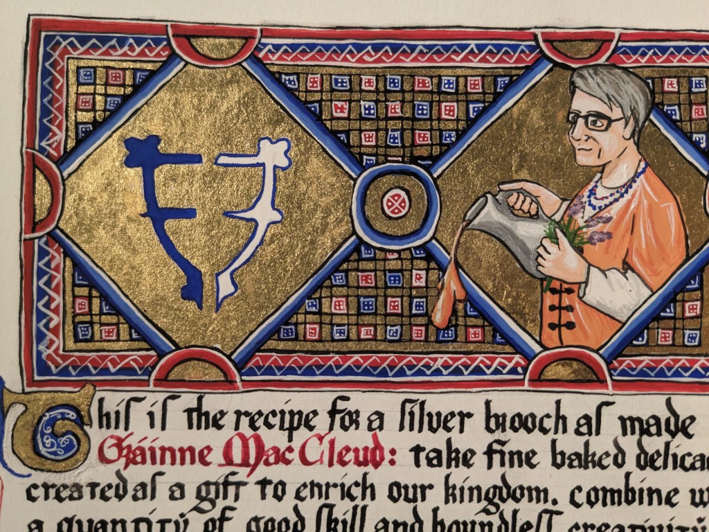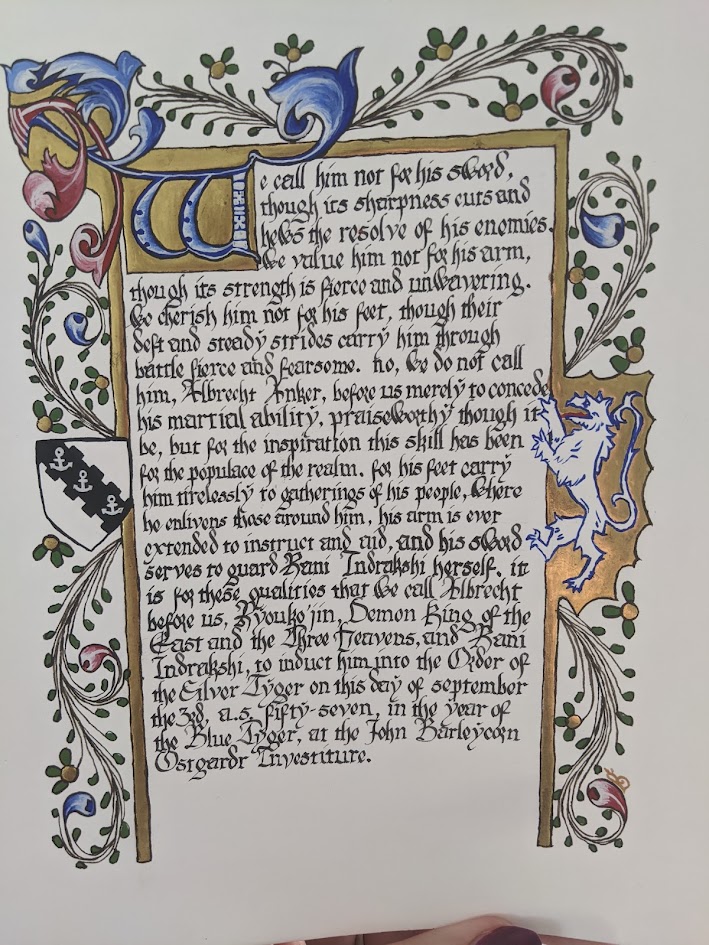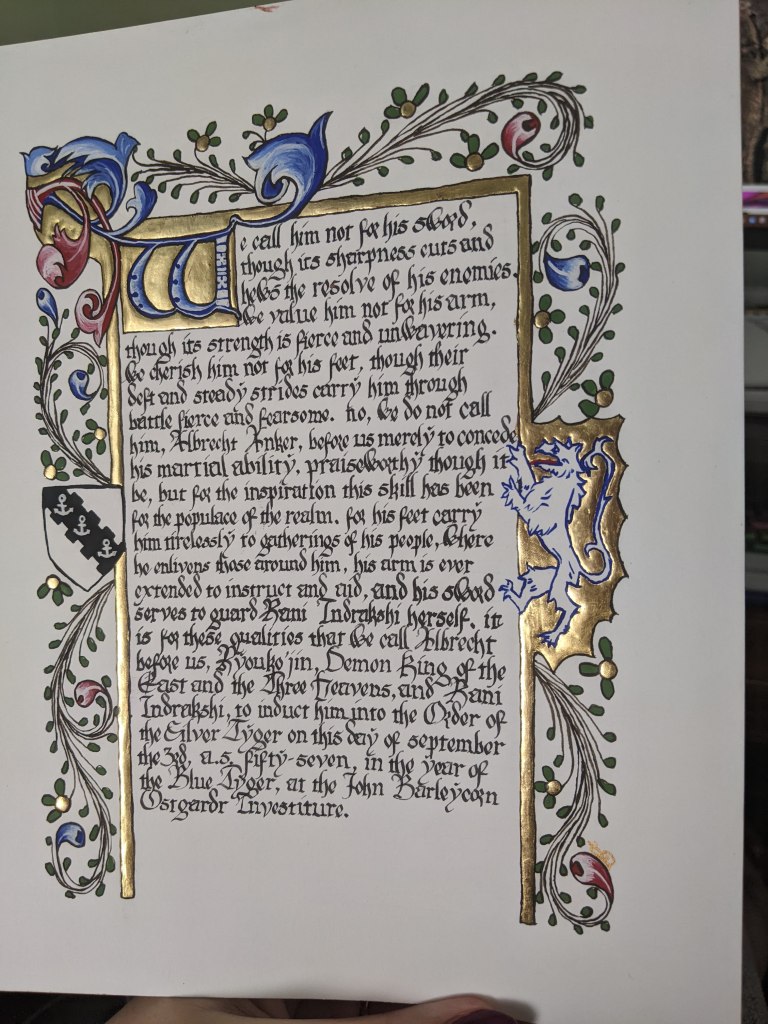 scroll based on the Illustrated Legends of the Kitano Tenjin Shrine (Kitano Tenjin engi emaki). Emaki are long rolled scrolls. To emulate this, I’ve created two scrolls that should be displayed horizontally to one another, with text on the rightJapanese calligraphy differs from European calligraphy in its philosophy. While European calligraphy emphasizes uniformity, Japanese calligraphy is meant to be expressive. This may look “messy” to our eye, but is intentional!GNEW 2025GNEW 2025The extant piece I referenced for this had lots of interesting text layout that I was really excited to replicate in this scrollViking scrolls deserve gold too! Based on metal weathervanes (such as the Soderala and Heggen weathervanes)My first Arabic-language scroll. I’ve learned a lot since I made this, and would change a lot the next time to be more accurate to Arabic exemplars.My second ever attempt at calligraphy and illumination, a gift for my brother. Had a TON of fun with this one!My first attempt at calligraphy and illumination. Not a bad start, certainly learned a lot!