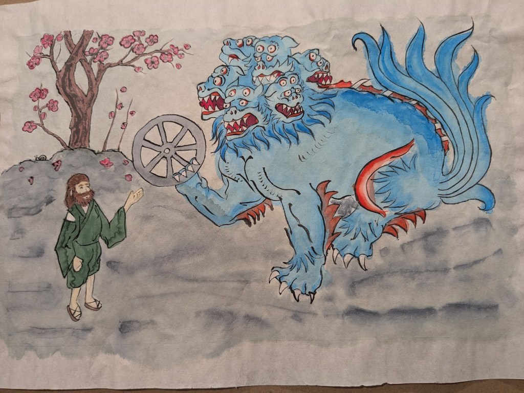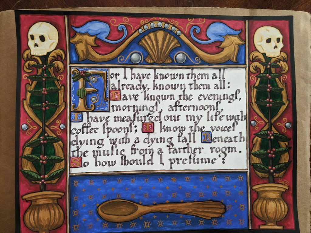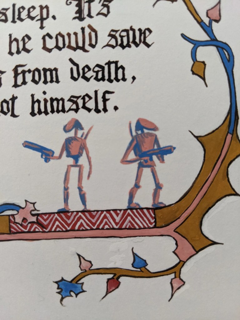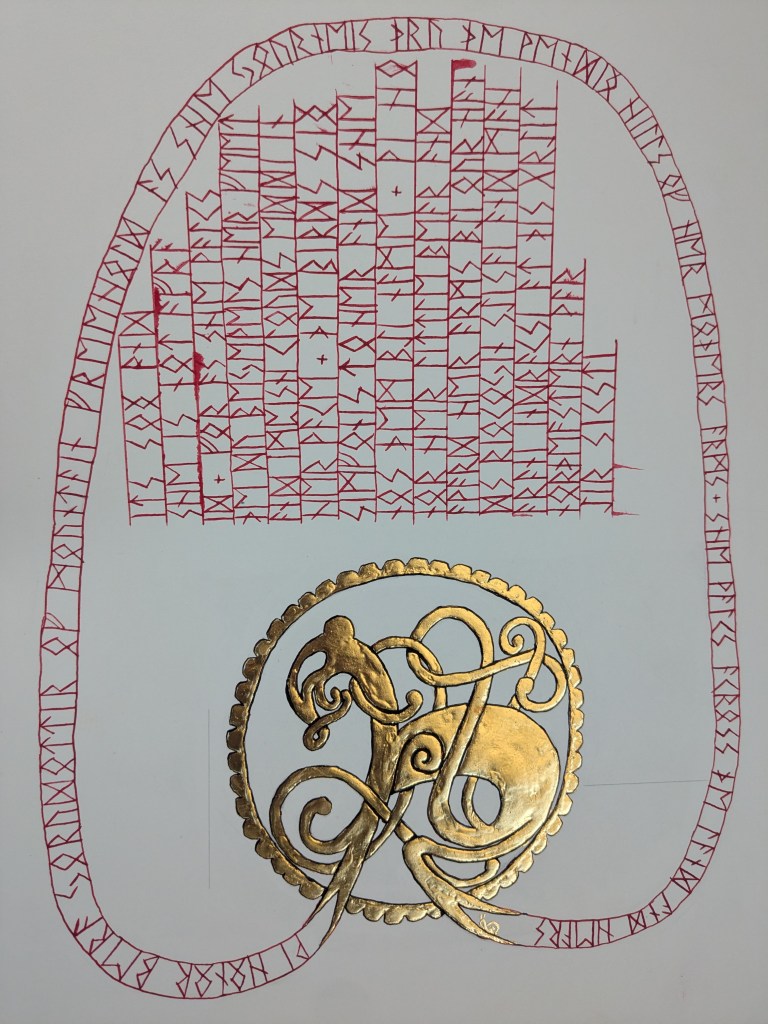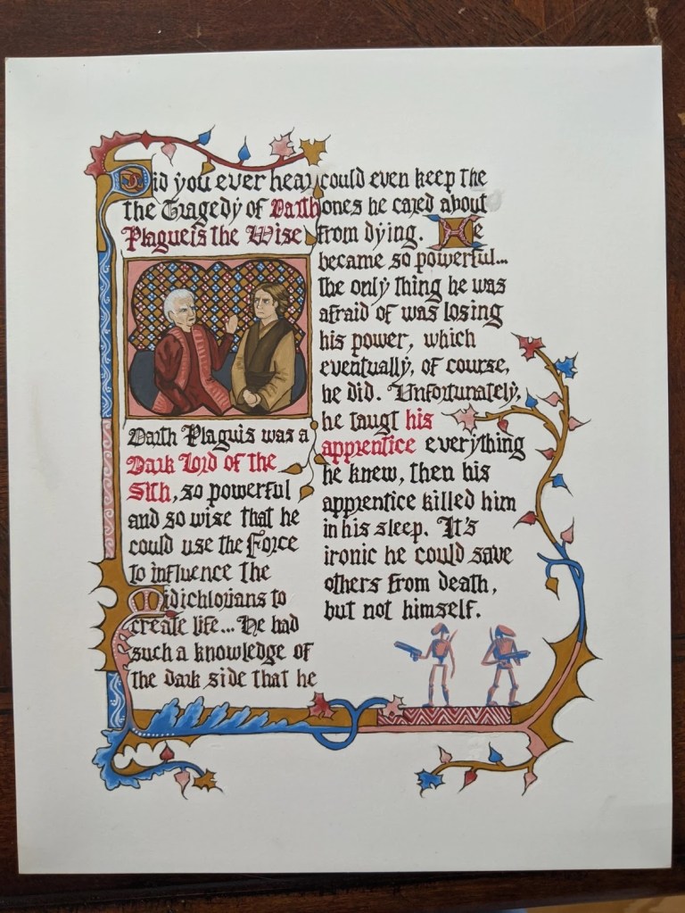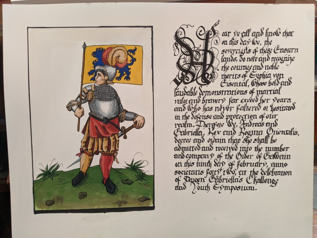 scroll based on the Illustrated Legends of the Kitano Tenjin Shrine (Kitano Tenjin engi emaki). Emaki are long rolled scrolls. To emulate this, I’ve created two scrolls that should be displayed horizontally to one another, with text on the rightJapanese calligraphy differs from European calligraphy in its philosophy. While European calligraphy emphasizes uniformity, Japanese calligraphy is meant to be expressive. This may look “messy” to our eye, but is intentional!GNEW 2025GNEW 2025The extant piece I referenced for this had lots of interesting text layout that I was really excited to replicate in this scrollViking scrolls deserve gold too! Based on metal weathervanes (such as the Soderala and Heggen weathervanes)My first Arabic-language scroll. I’ve learned a lot since I made this, and would change a lot the next time to be more accurate to Arabic exemplars.My second ever attempt at calligraphy and illumination, a gift for my brother. Had a TON of fun with this one!My first attempt at calligraphy and illumination. Not a bad start, certainly learned a lot!
